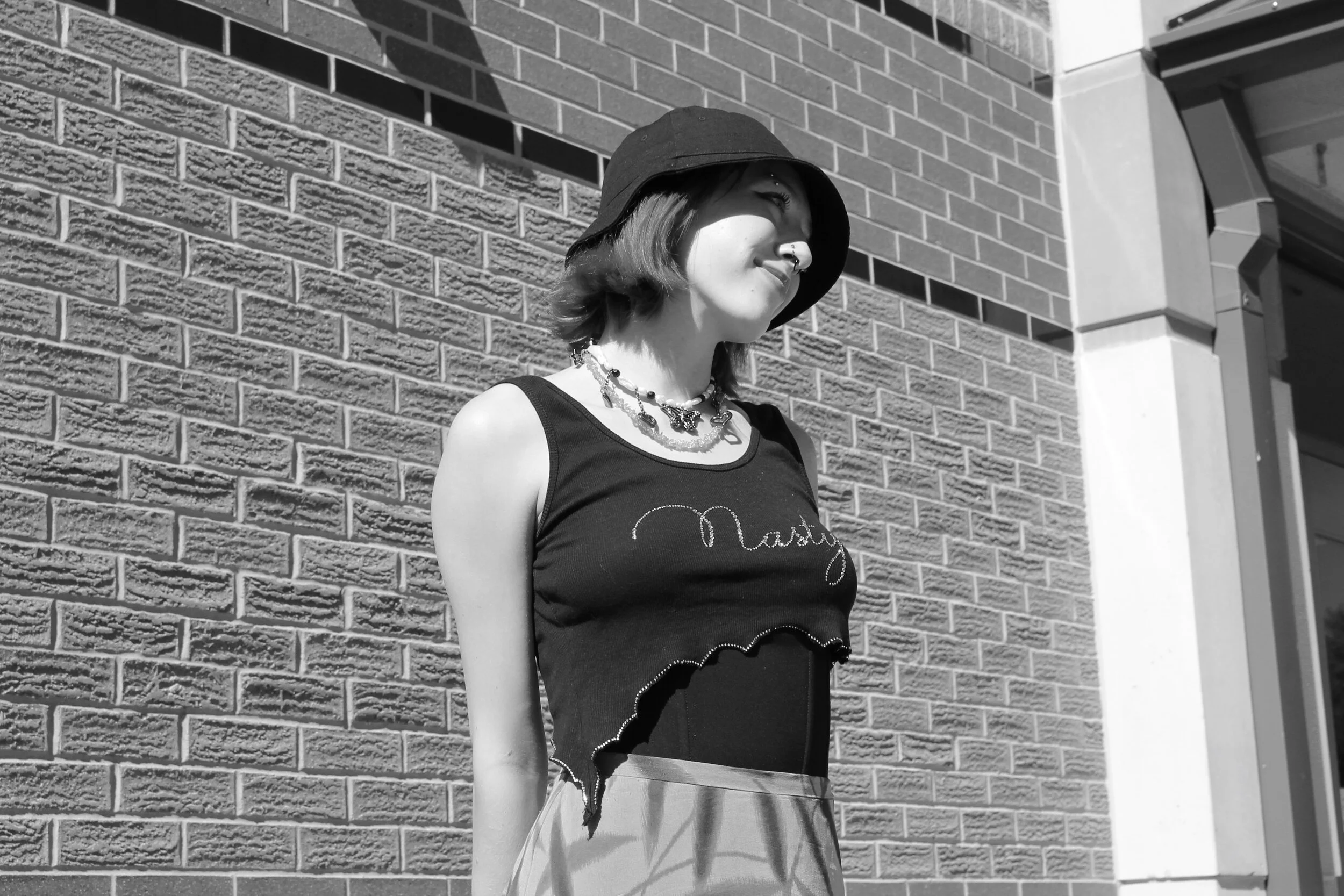 Though she takes some inspiration from her friends, Ellie feels that she has developed a style that is uniquely her own. A uniqueness that doesn’t stop with articles of clothing; Ellie’s accessorization also plays a big role in her look, with various nose piercings, an eyebrow piercing, and layers of chunky necklaces. Shopping mostly at thrift stores, along with a few retail stores like Akira, Ellie has crafted her sense of style on funky statement pieces and color matching.